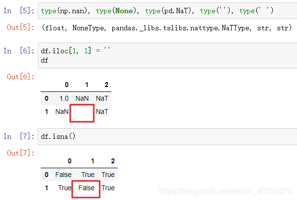 从Python解释器来看,np.nan的类型是float,None的类型是NoneType,两者在Pandas中都显示为NaN,pd.NaT的类型是Pandas中的NaTType,显示为NaT。而不管是空字符串还是空格,其数据类型都是字符串,Pandas判断的结果不是空值。