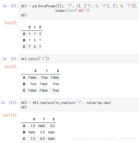 isin(values): 判断Series或DataFrame中是否包含某些值,可以传入一个可迭代对象、Series、DataFrame或字典。在我们判断某个自定义的缺失值是否存在于数据中时,用列表的方式传入就可以了。