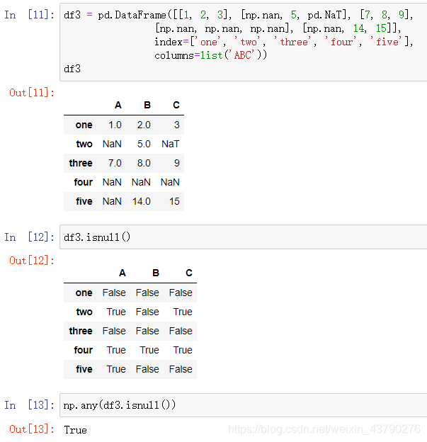 isnull(): 判断Series或DataFrame中是否包含空值,与isna()结果相同,与notnull()结果相反。返回结果是一个与原数据形状相同的Series或DataFrame。