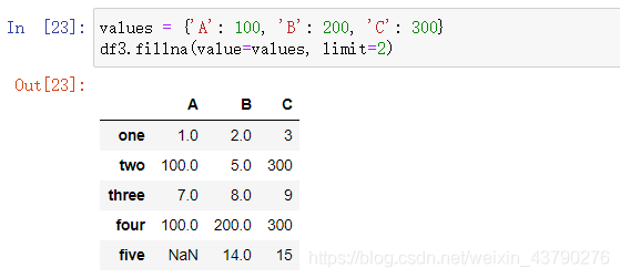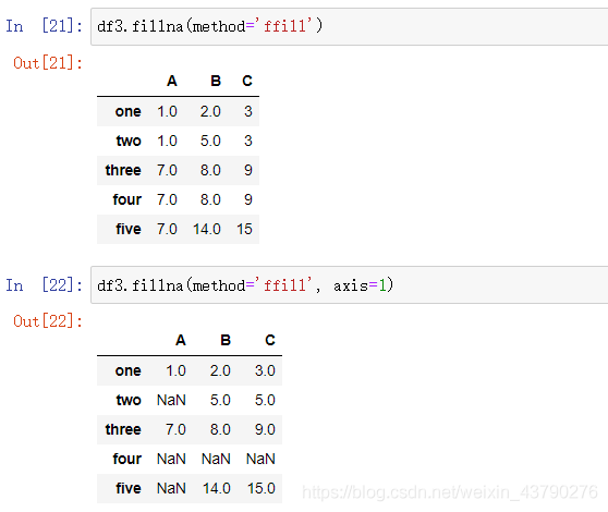 method: 填充的方式,默认为None。有 ffill,pad,bfill,backfill 四种填充方式可以使用,ffill 和 pad 表示用缺失值的前一个值填充,如果axis=0,则用空值上一行的值填充,如果axis=1,则用空值左边的值填充。假如空值在第一行或第一列,以及空值前面的值全都是空值,则无法获取到可用的填充值,填充后依然保持空值。bfill 和 backfill 表示用缺失值的后一个值填充,axis的用法以及找不到填充值的情况同 ffill 和 pad 。