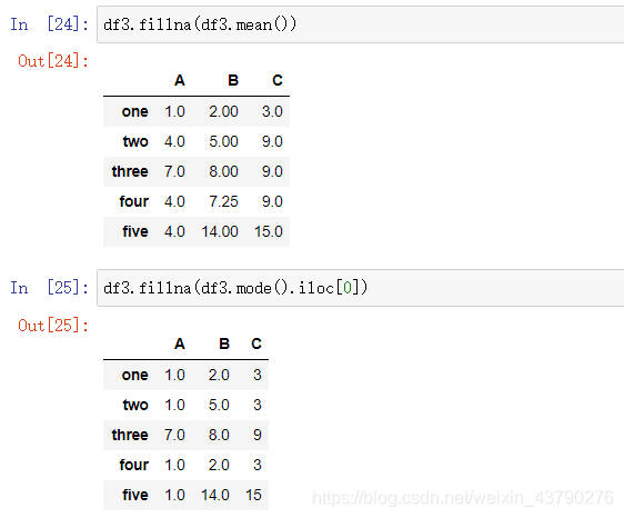 在缺失值填充时,填充值是自定义的,对于数值型数据,最常用的两种填充值是用该列的均值和众数。DataFrame的众数也是一个DataFrame数据,众数可能有多个(极限情况下,当数据中没有重复值时,众数就是原DataFrame本身),所以用mode()函数求众数时取第一行用于填充就行了。