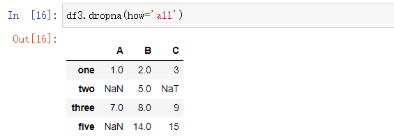 how: how参数默认为any,只要一行(或列)数据中有空值就会删除该行(或列)。将how参数修改为all,则只有一行(或列)数据中全部都是空值才会删除该行(或列)。