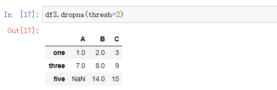 thresh: 表示删除空值的界限,传入一个整数。如果一行(或列)数据中少于thresh个非空值(non-NA values),则删除。也就是说,一行(或列)数据中至少要有thresh个非空值,否则删除。