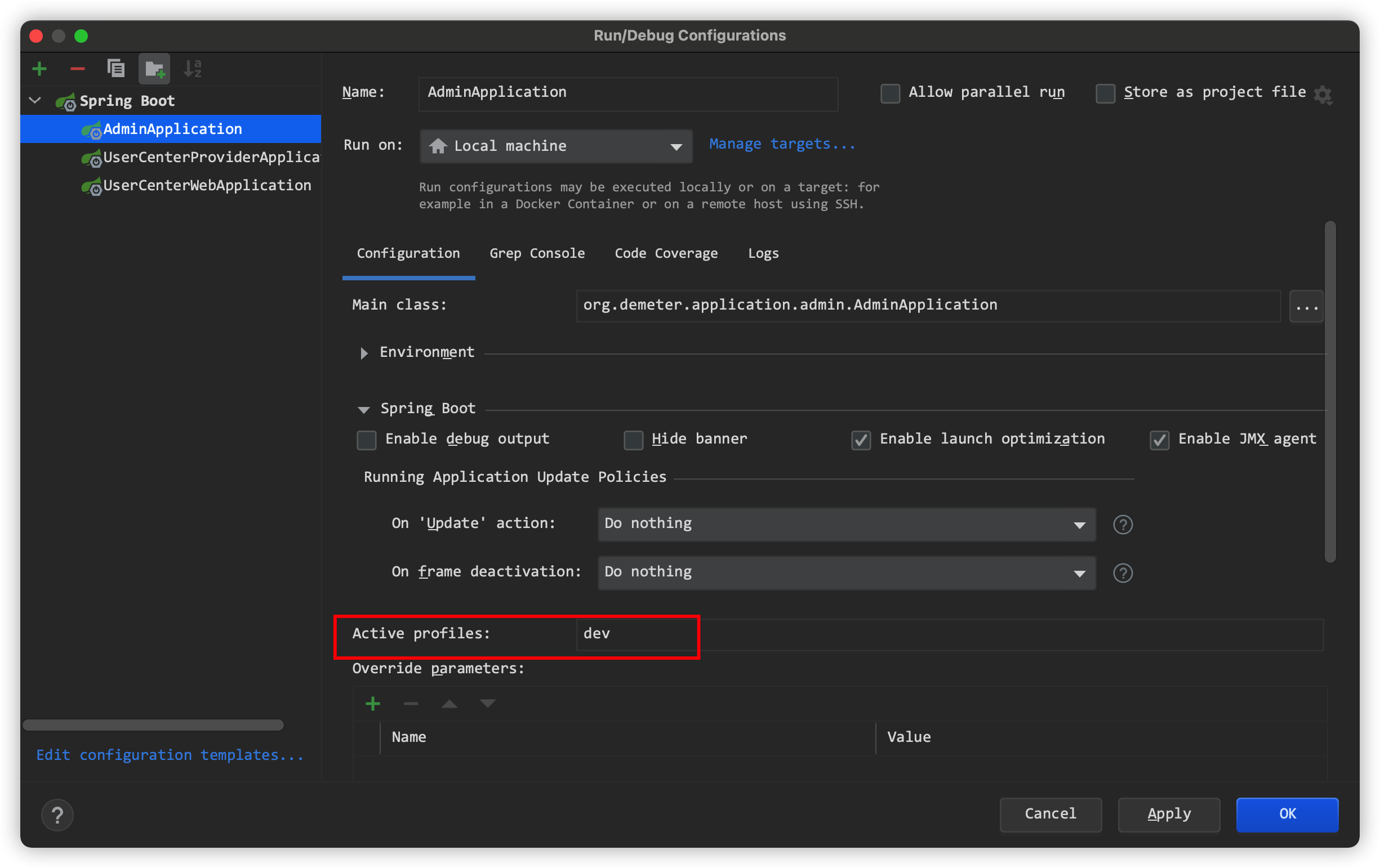 注意:由于spring cloud alibaba nacos config的加载机制问题,配置信息如果写在了application-{env}.properties的配置文件中无法被解析。所以如果需要分多环境动态加载,可以写在bootstrap-{env}.properties文件中。 启动的时候配置active profiles+ 环境就可以正确读取配置了