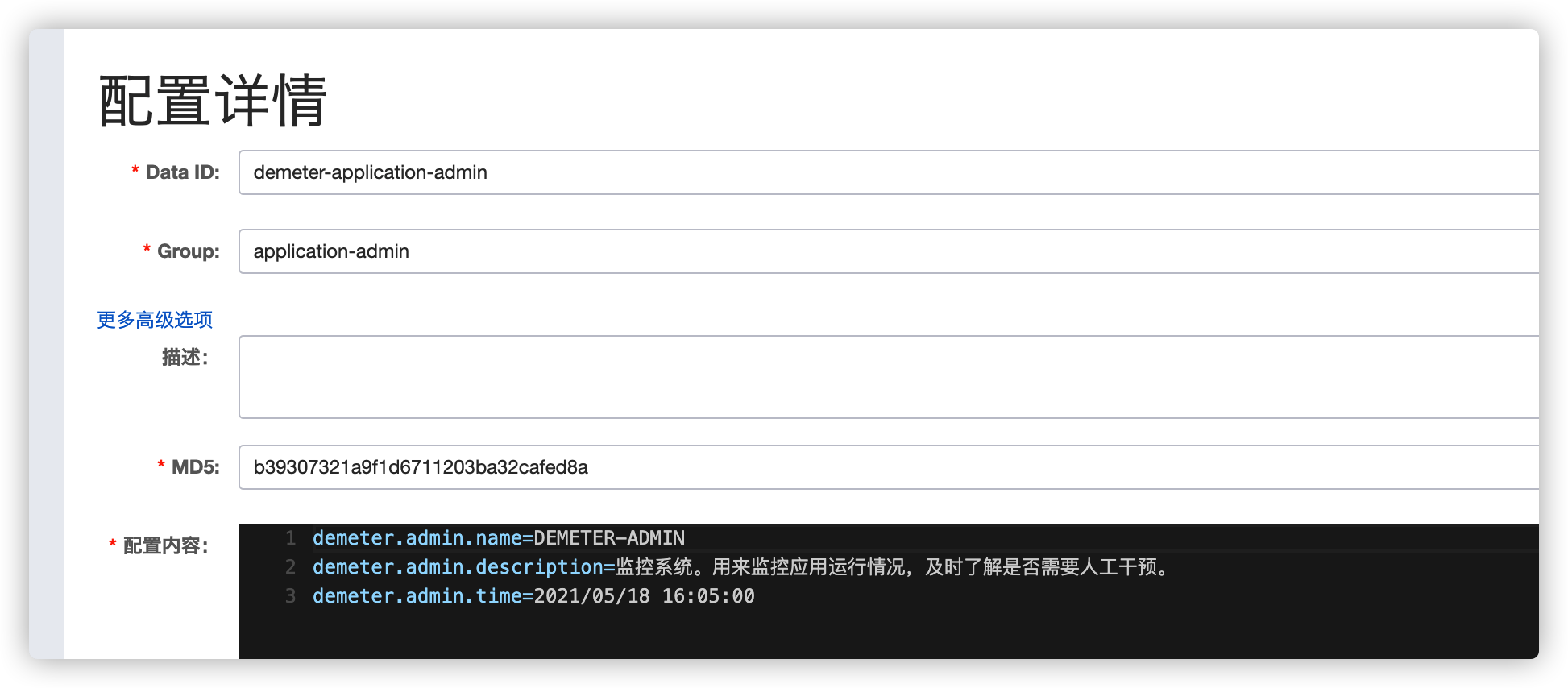 在名为config-dev的namespace中新建配置demeter-application-admin。