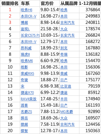 销量排名 车系 官方价 从属品牌 1-12月销量