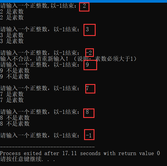 printf("输入不合法,请重新输入!(说明:素数必须大于1)