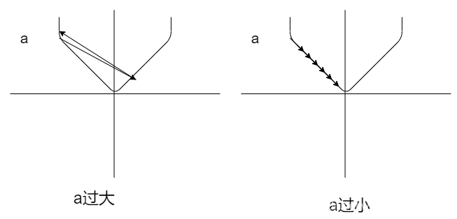 其中a为学习率,即梯度下降的步长,如果a太大,就可能错过最优值,如果a太小,则就需要更多步才能找到最优值。所以选择合适的学习率很关键。