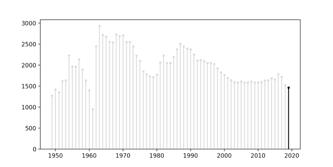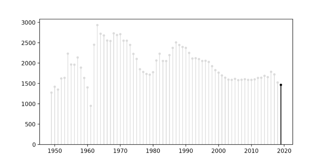 plt.text(2019, value_2019+80, value_2019, ha='center')