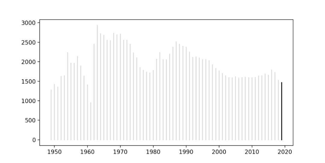 给2019年的条形着色为黑色,其他年份为浅灰色。