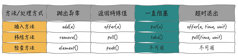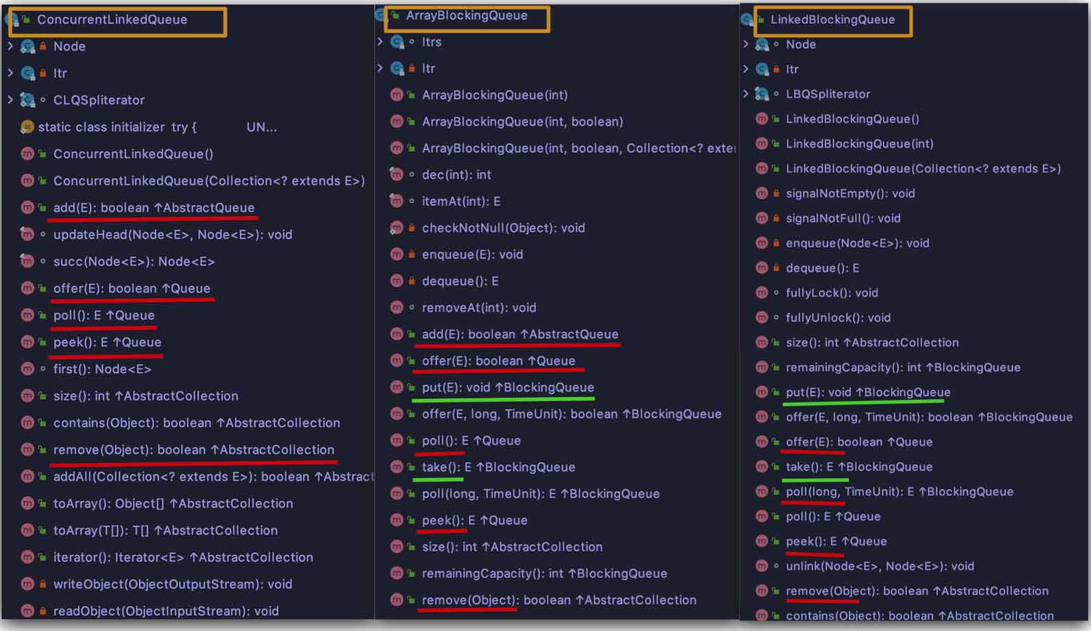 如果你在 IDE 中打开以上非阻塞队列和阻塞队列,查看其实现方法,你就会发现,阻塞队列较非阻塞队列 额外支持两种操作: