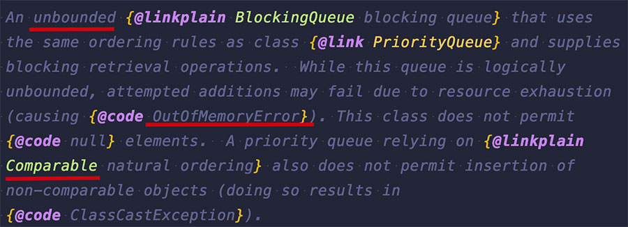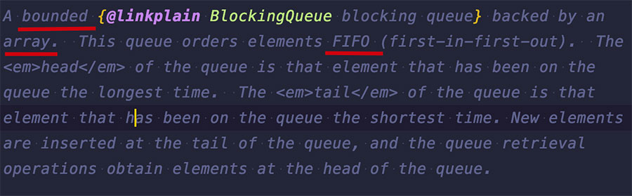 填鸭式的说明也容易忘,这些都是哪看到的呢?在所有队列的 Java docs 的第一段,一句话就概括了该队列的主要特性,所以强烈建议大家自己在看源码时,简单瞄一眼 docs 开头,心中就有多半个数了