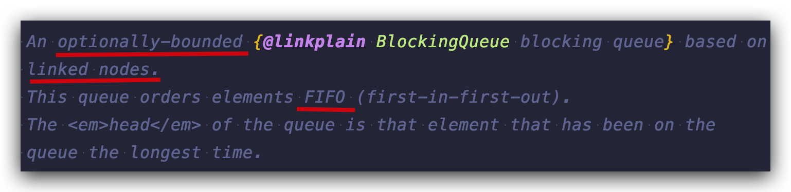 LinkedBlockingQueue 也算是一个有界阻塞队列 ,从下面的构造函数中你也可以看出,该队列的默认和最大长度为 Integer.MAX_VALUE ,这也就 docs 说 optionally-bounded 的原因了