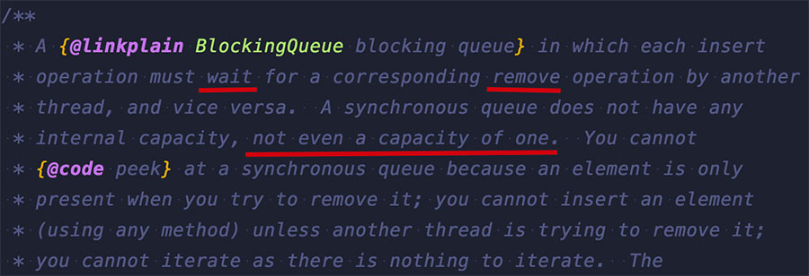 所以使用它,每个put() 操作必须要等待一个 take() 操作,反之亦然,否则不能继续添加元素