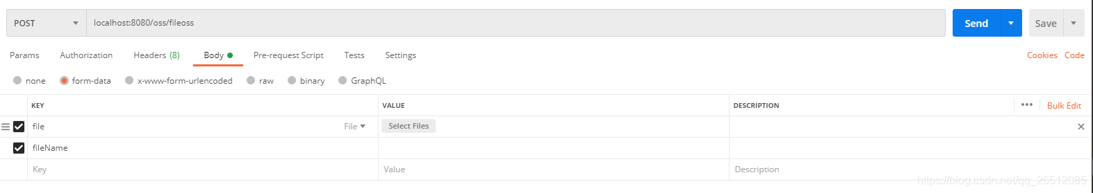 -----第一列数据:KEY为file,选择类型为File,添加VALUE为自己想要上传的文件;