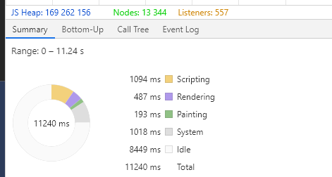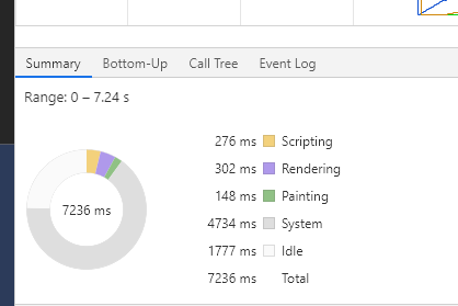 在完成这个动动画效果之后遇到一个至今原因不明的bug,随着屏幕放置时间的变长,动画越来越慢,打开任务管理器,未见内存泄漏或者cpu使用率过高。打开performance,发现页面调帧严重,屏幕帧数越来越低,单个Frame CPU time越来越长,范围来看,script和render和paint耗时未发生线性变化,只有system时间越来越来长,越来越长,期望能被大佬告知原因