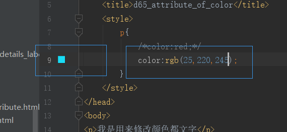 注:红绿蓝三原色,格式:rgb(255,0,0)代表红色,里面的数字分别代表红绿蓝三原色各自的亮度,webstorm很智能,可以写代码时直接在旁边显示颜色。