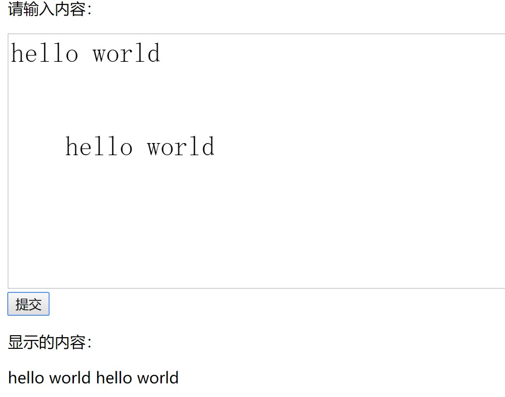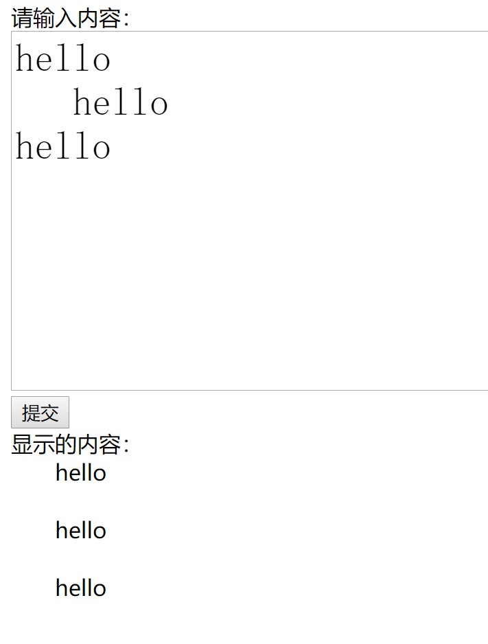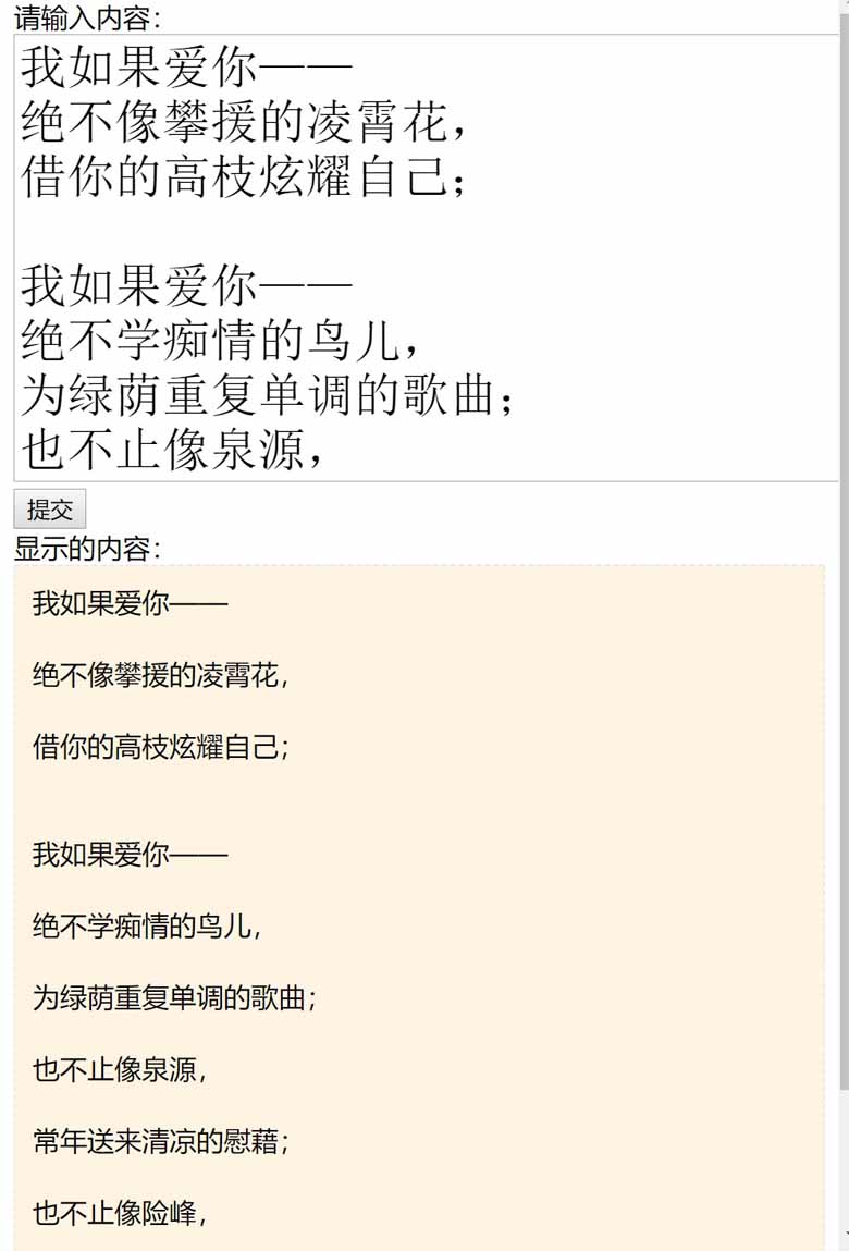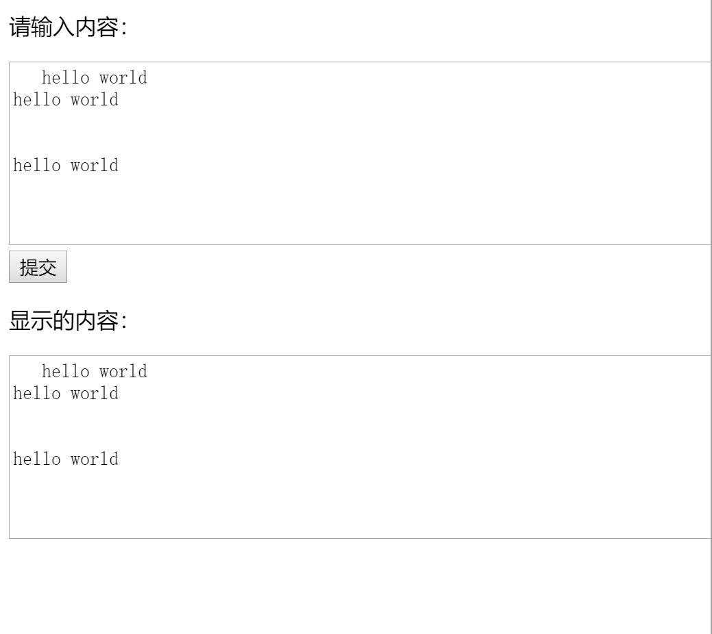 将 div 替换成 pre 标签,将提交的文本显示在 pre 标签里面。pre 元素可定义预格式化的文本。被包围在 pre 元素中的文本通常会保留空格和换行符,他比较常见的应用就是用来显示代码,在技术网站和博客的页面里面,pre 标签都是用来包裹代码块的。