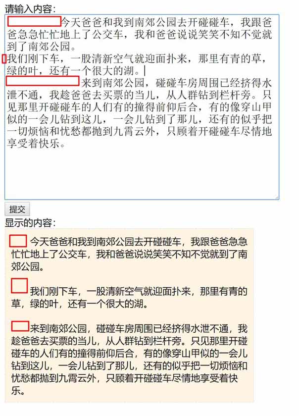 可以从下图的效果看出,pre 标签也可以完全实现保留用户所输入的空格和换行,看上去似乎能够达到我的基本需求了。那么接下来的问题就是,如何去掉空格,并且实现自动缩进2个字符。