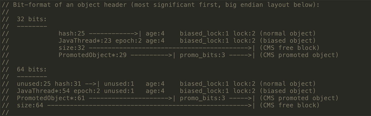 Mark Word在32位JVM中的长度是32bit,在64位JVM中长度是64bit。我们打开openjdk的源码包,对应路径/openjdk/hotspot/src/share/vm/oops