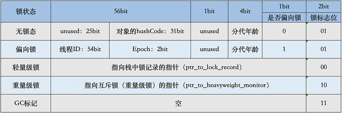 - biased_lock:是否偏向锁,由于无锁和偏向锁的锁标识都是 01,没办法区分,这里引入一位的偏向锁标识位。