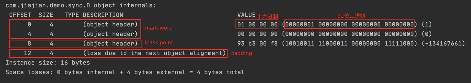 可以看到,d对象实例共占据16byte,对象头(object header)占据12byte(96bit),其中 mark word占8byte(64bit),klass pointe 占4byte,另外剩余4byte是填充对齐的。