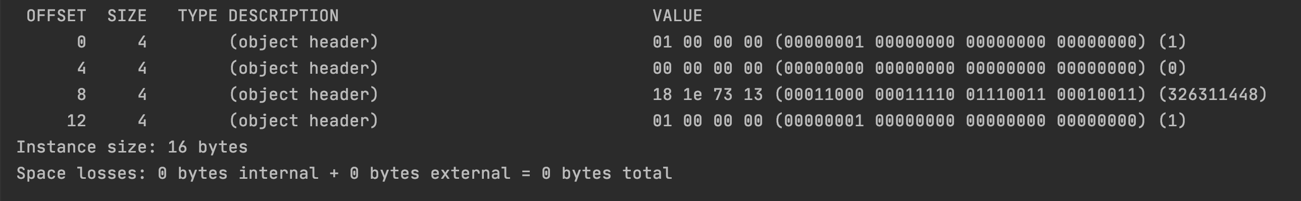 System.out.println(ClassLayout.parseInstance(a).toPrintable());